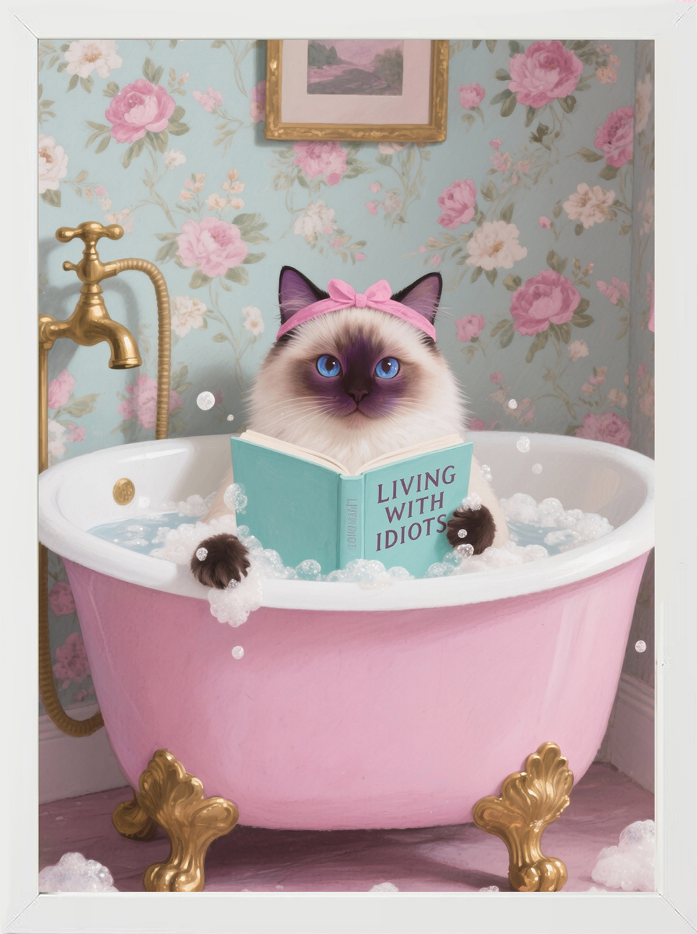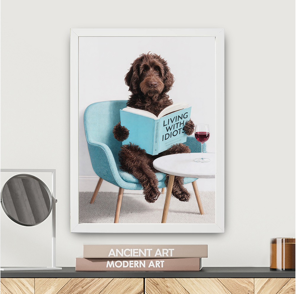 We generate your special custom wall art from the information or photo you provide, using our own special watercolour effect AI software. We render a unique image of your own pet, with maybe a cocktail of your choice, in a bath, or reading a book, or sipping champagne or red wine in a chair, even a book of your own title. We customize just for you!